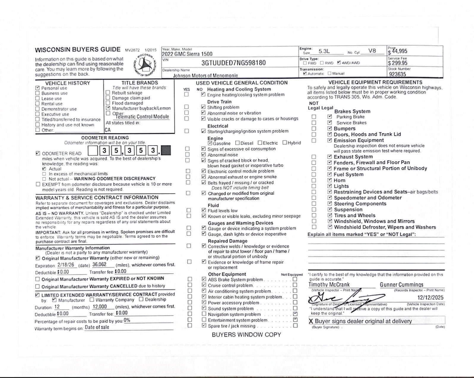 Price does not include sales tax, title, registration, or $299.95 service fee.