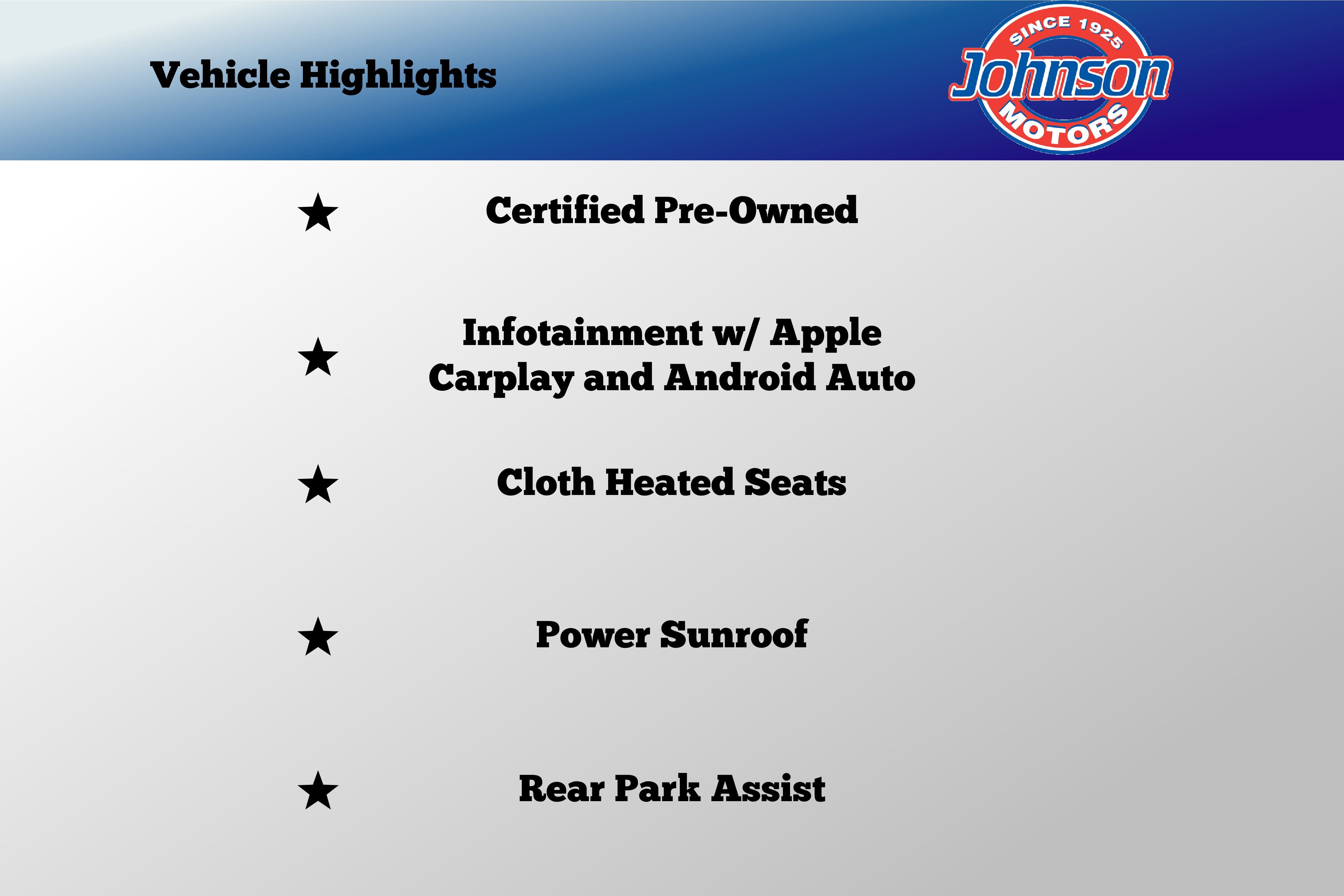 Backed by Johnson Motors' 100-year legacy --- you're buying from a dealership with deep roots and strong community trust