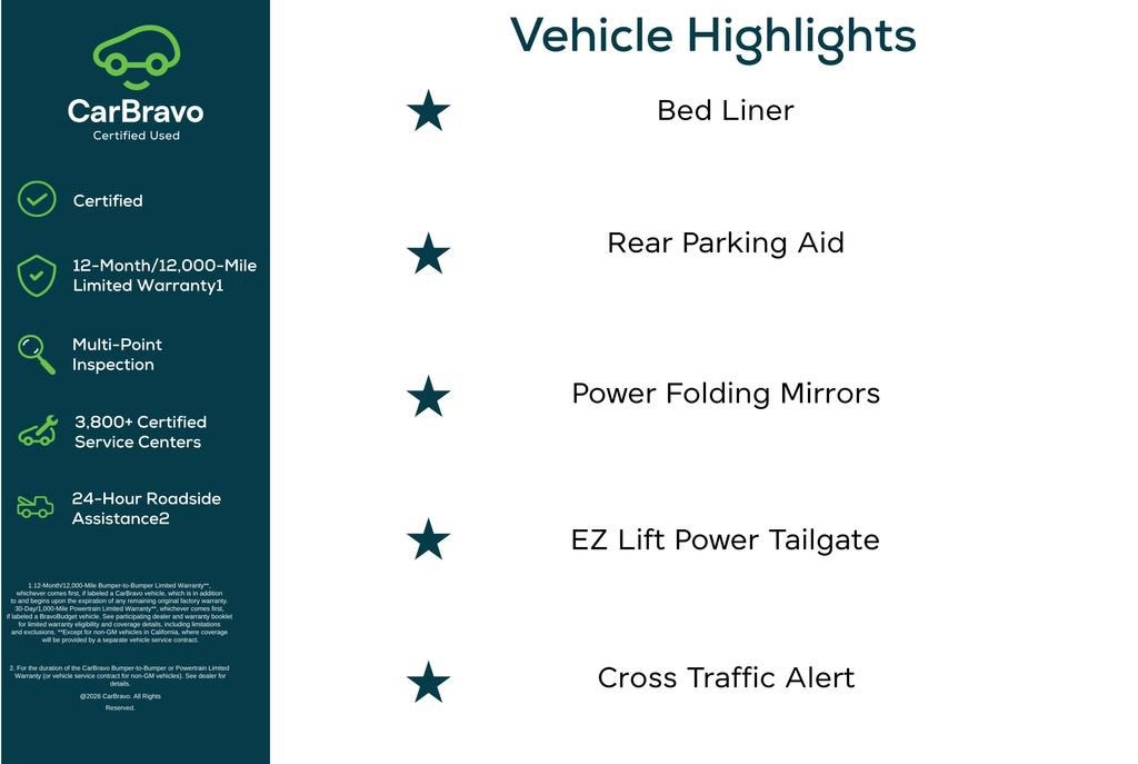 Certification Program Details: CarBravo Standard Certified 12-month/12,000 mile limited warranty * 24 hour roadside assistance** *12-Month/12,000-Mile Bumper-to-Bumper Limited Warranty**, whichever comes first, in addition to any remaining original factory Bumper-to-Bumper warranty. See participating dealer and warranty booklet for limited warranty eligibility and coverage details, including limitations and exclusions. **Except for non-GM vehicles in California, where coverage will be provided by a separate vehicle service contract. **For the duration of the CarBravo Bumper-to-Bumper or Powertrain Limited Warranty (or vehicle service contract for non-GM vehicles). See dealer for details.